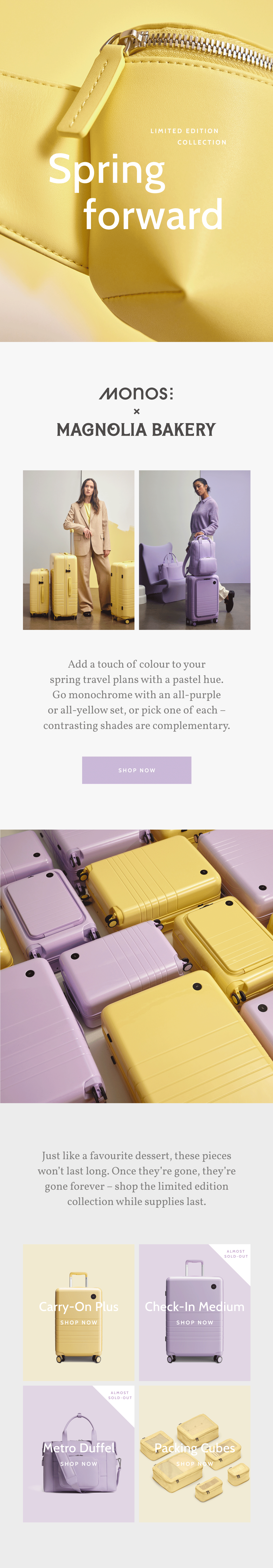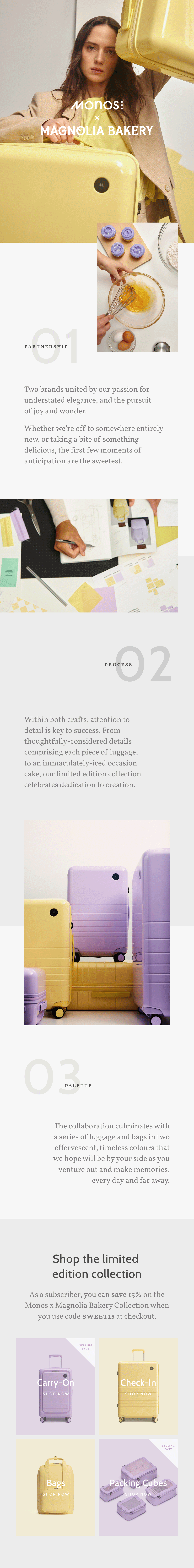 This collaboration with New York City-based Magnolia Bakery is a delectable collection of luggage and bags inspired by much-loved desserts. An all-new glossy finish and two limited-edition colourways pay homage to Magnolia Bakery’s world-famous Banana Pudding and rich buttercream Purple Icing. Travel never looked so sweet.